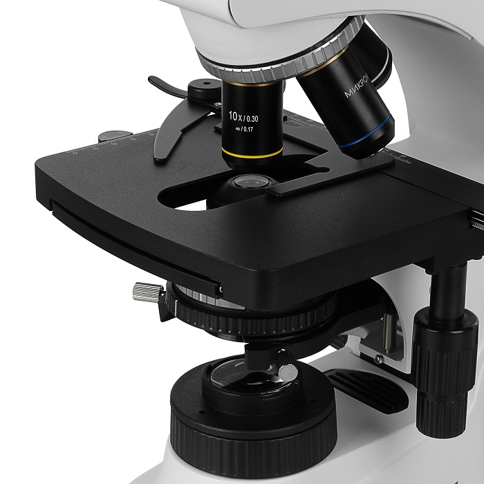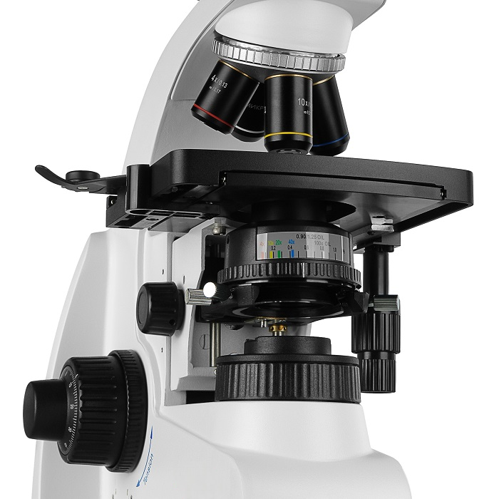 В комплекте микроскопа объективы с коррекцией на бесконечность 4x/0.13, 10x/0.30, 40x/0.70 и иммерсионный объектив 100x/1.25 oil. По дополнительному заказу может быть приобретен объектив 60х/0.80. Высокое оптическое качество объективов обеспечивает информативность и комфорт при исследованиях и отличное качество записываемых изображений. Объективы стандартизованы по DIN и имеют парфокальную высоту 45 мм.